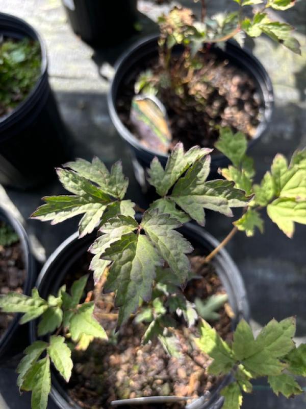 Vigorus black leaved variety with lacy black foliage and lovely dark stems. Beautiful purple tinted white flowers raise 2 feet upward and carry an exotic perfume of grape and jasmine. Foliage will be darker in more sun. Part shade or full sun in moist humus rich soil. Needs constant moisture in full sun. Large dramatic contrast foliage plant for edge of woods or back of semi shady border.  Plant with digitalis, anemone, Iris versicolor, and eupatorium.