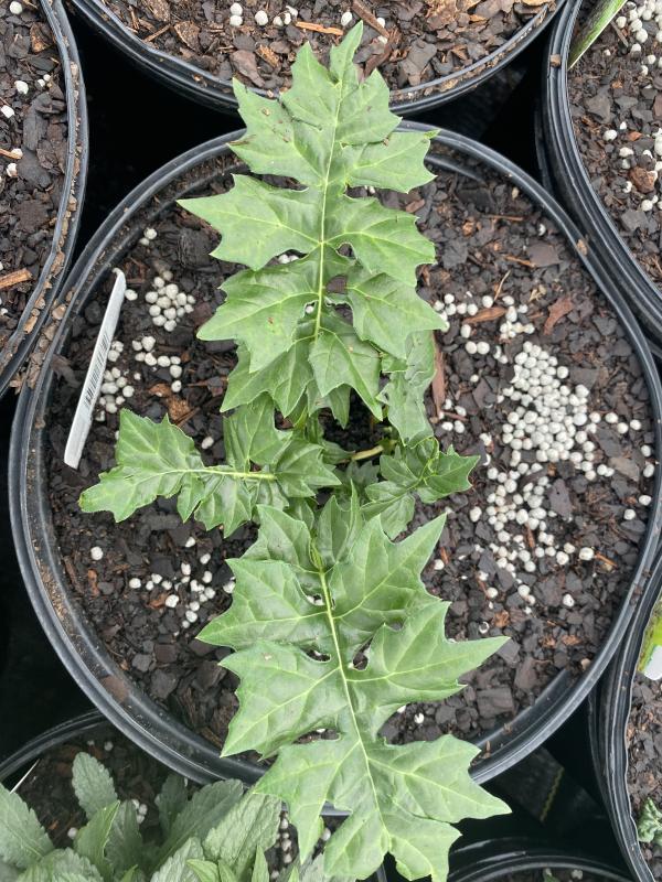 Large dramatic plant with huge dark green and glossy, deeply divided, spiny leaves. Spikes of prehistoric looking flowers appear in summer. Deadhead quickly after bloom to rejuvenate plant. Fertile, well-drained soil in full sun or light shade. Mulch well. Zone 6-10. Dramatic foliage and imposing flower spikes makes this plant stand out in any border. Very bold texture. Deer and Rabbit Resistant
