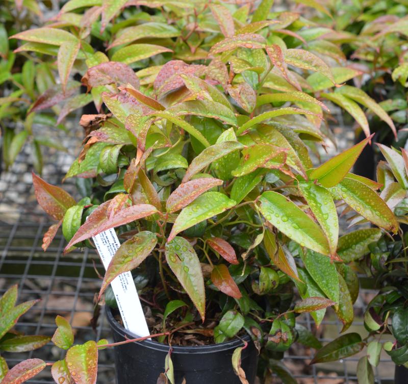 A low-growing hybrid with bright scarlet new growth that matures a deep, dark glossy green, then turns burgun-red for fall and winter. Pick your level of shade. Needs average to moist acidic soil. Will not tolerate cold winter wind. Think foliage as much as flowers. Use as a foundation plant or to naturalize in a border. Zone: 5 - 8.
