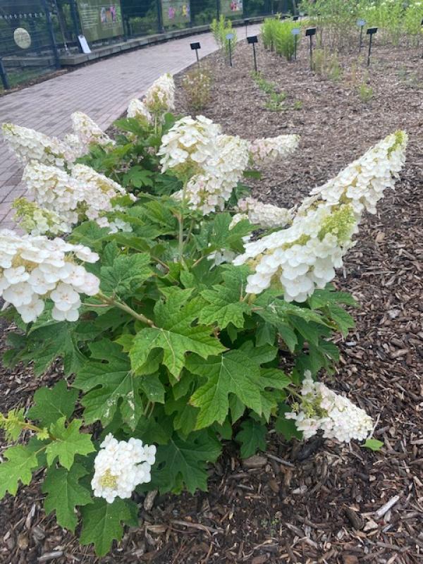 Ruby Slippers' has something to offer every season! Spring ushers in large, dark green, oak-shaped leaves. Then, early summer sets off a profusion of white conical flowers that soon turn shades of pink to ruby red, hence the name 'Ruby Slippers'. Come fall that deep green foliage has turned mahogany red. Finally, once winter has arrived and the foliage has fallen away, you can appreciate the attractive exfoliating bark. Leave on dried flowers for extra winter appreciation.