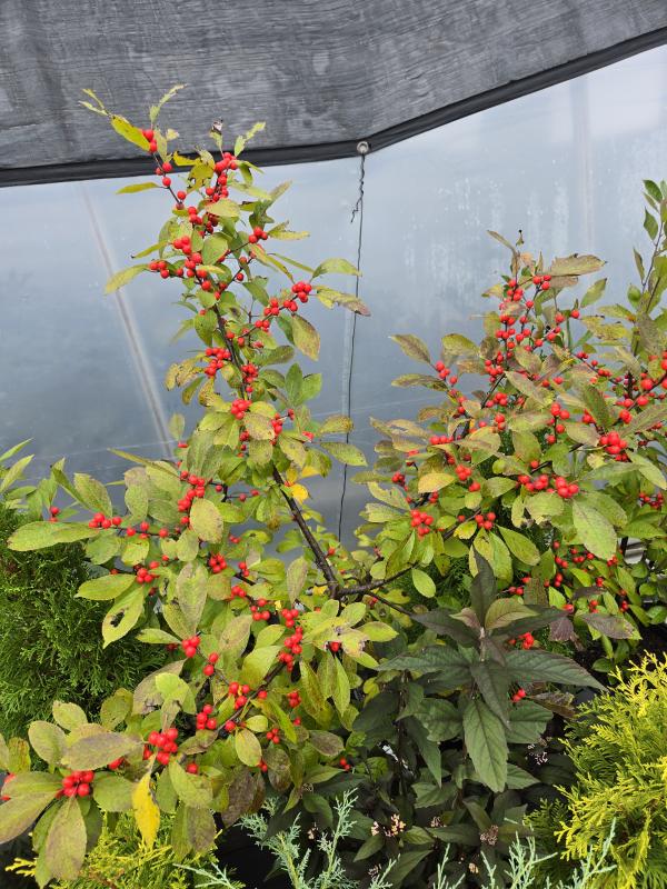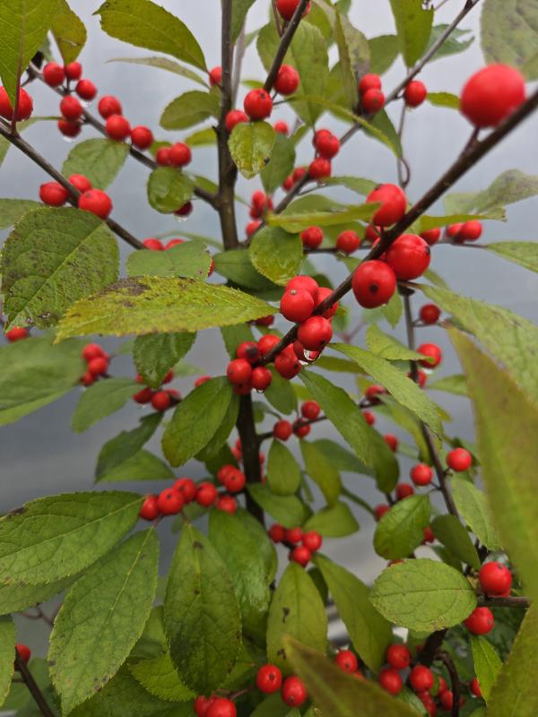 ‘Berry Heavy’s’ small white flowers are pollinated by ‘Mr. Poppins’ in spring. After leaves drop in fall, the astonishing vibrancy of these bright red berries is able to fully shine! Use as a specimen or in groups. One male plant will pollinate 5-7 female plants; plant within 50’ of one another to assure good pollination. An excellent rain garden, boggy soil, wetland or riparian choice.
