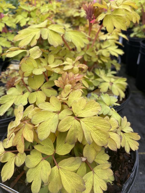 The first gold foliage Bleeding Heart with truly red flowers. A wonderful improvement from ‘Gold Heart’, it is vigorous and  long lasting in the garden. Prefers partial shade in well-drained hummus rich soil. Bright red, heart shaped flowers hang on arching stems. Prefers partial shade in well-drained hummus rich soil.  Zones 4-8. Deer resistant.