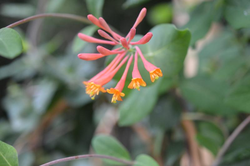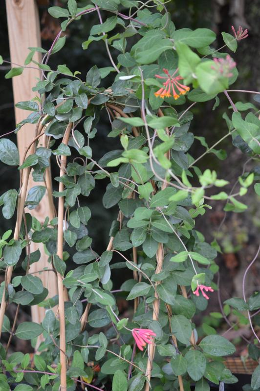 Common twining native Honeysuckle vine, selected for orange-red flowers and very narrow and blue leaves. This vine is a fantastic climber and works well along fences, trellises. De to its density of flowers and foliage it works well for a screen.