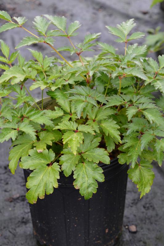 A vigorous grower with deeply incised, fine-textured, shiny, dark bronze- green, foliage. Bears large plumes of light pink blooms that contrast nicely with their dark leaves. Broad, pyramidal, airy, light pink plumes that turn into rust colored seed heads in fall. Partial shade to full sun in organically rich, moist soil that does not dry out. Likes a boggy area in full sun.