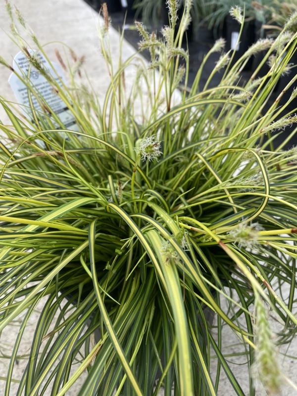 A superb ground cover and container plant with distinctive lime yellow striped foliage. Easy to grow, low maintenance and forms a neat, easily controlled mound. This grass is evergreen, adding winter interest to your garden. Partial to Full Shade. Sedges will take more shade than most ornamental grasses.  Desires moist, but well-drained to dry soil.  Will do well in most sites.  Zone 6-8. Tolerates dry shade with occasional watering. Deer resistant.