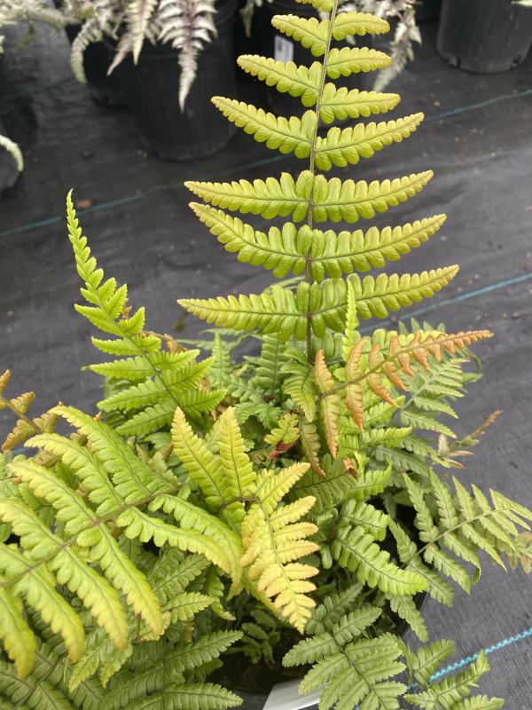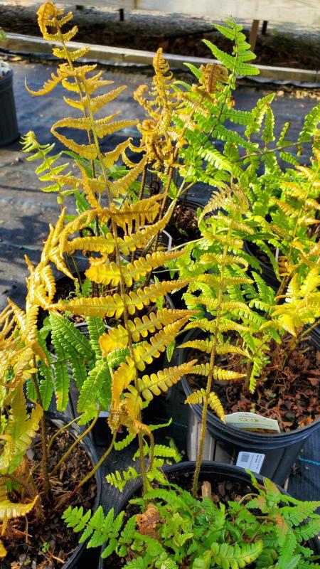 Fiddleheads emerge bright golden orange and unfold to reveal striking yellow/gold foliage . As they mature, fronds continue to show off their bold coloring, they add a unique quality to your shade garden. Grown as an ornamental foliage plant. Evenly moist, woodland soil in full to partial shade. Zone 5-9.