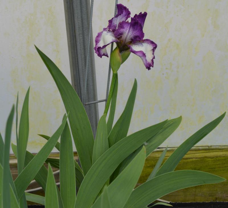 Fans of broad, flat, pointed leaves grow from thick rhizomes that creep along the soil surface. Flower stalks emerge bearing large buds that open to big papery irises with bearded falls. Blooms in June, will re-bloom in august and September. Intense, deep, purple is paired with near white to give this flower striking contrast. Full sun in average to dry, well drained soil that does not remain too wet in winter. Zone 3-8.