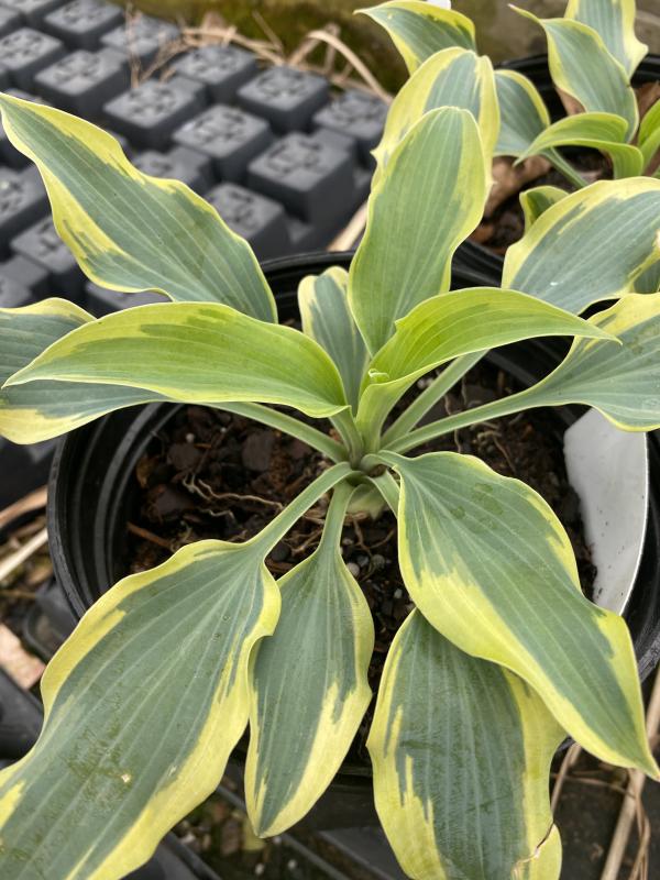 A mini hosta with lance shaped blue green leaves bearing a narrow chartreuse margin. Great mixed container hosta. Near white flowers on one foot scapes. Easy to grow, long-lived plants. They perform best in a shady spot with evenly moist soil, but will do well in a shady dry spot if well mulched. Zone 3-9