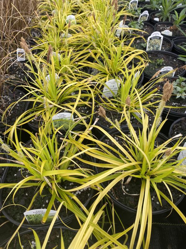 This bold colored grass would be beautiful in a patio pot as well as in the garden. This plant is fairly low maintenance. Group together to form an eye catching ground cover, or use to edge walkways and paths. Partial to Full Shade. Sedges will take more shade than most ornamental grasses. Desires moist to wet well draining soil. Will do well in most sites. Zone 6-8. Tolerates dry shade with occasional watering. Deer resistant.