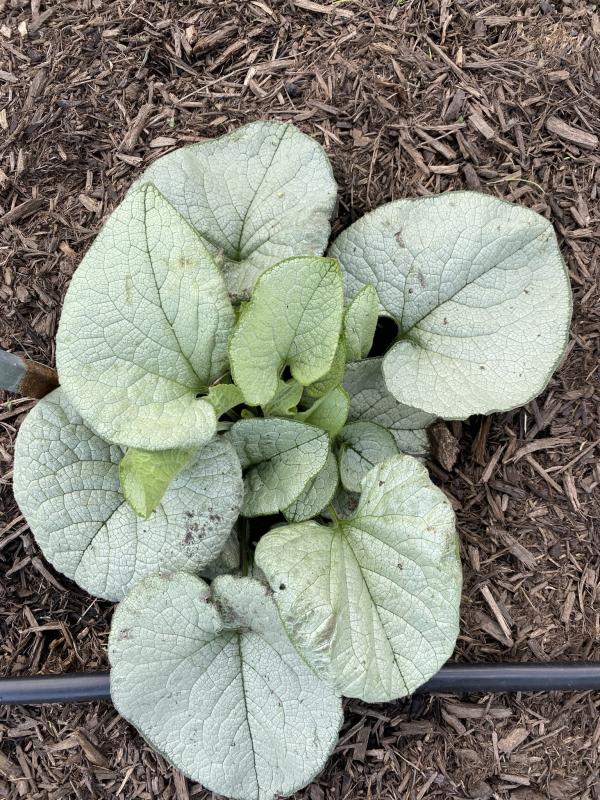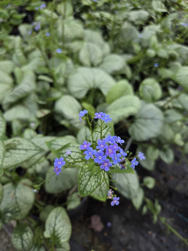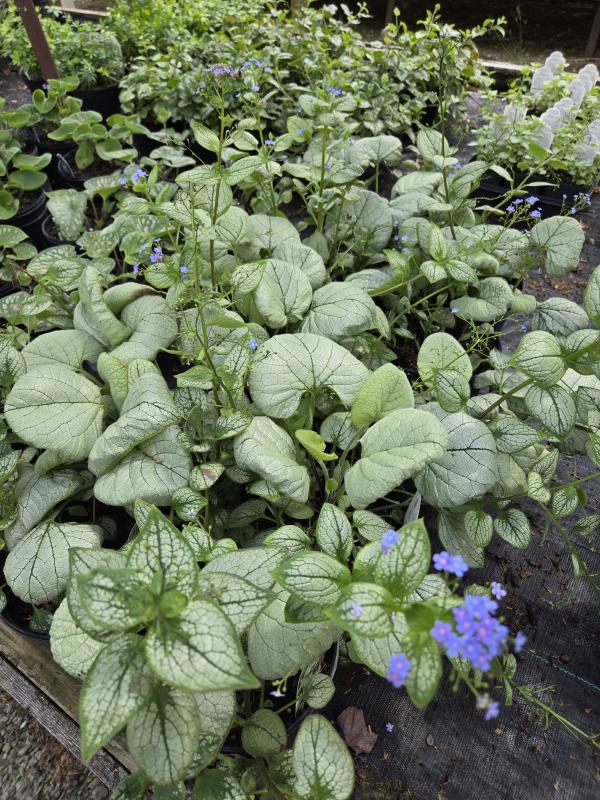 Plant forms a clump of heart shaped, rough textured greenish-white overlayed silvery leaves  and produces a spray of airy bi-color flowers in early spring. Blooms open white & blue maturing to lavender purple. Full to part shade in moist soil. Zone 4 - 8. Plant in shady border or woodland walk where bright foliage will provide interest all season.