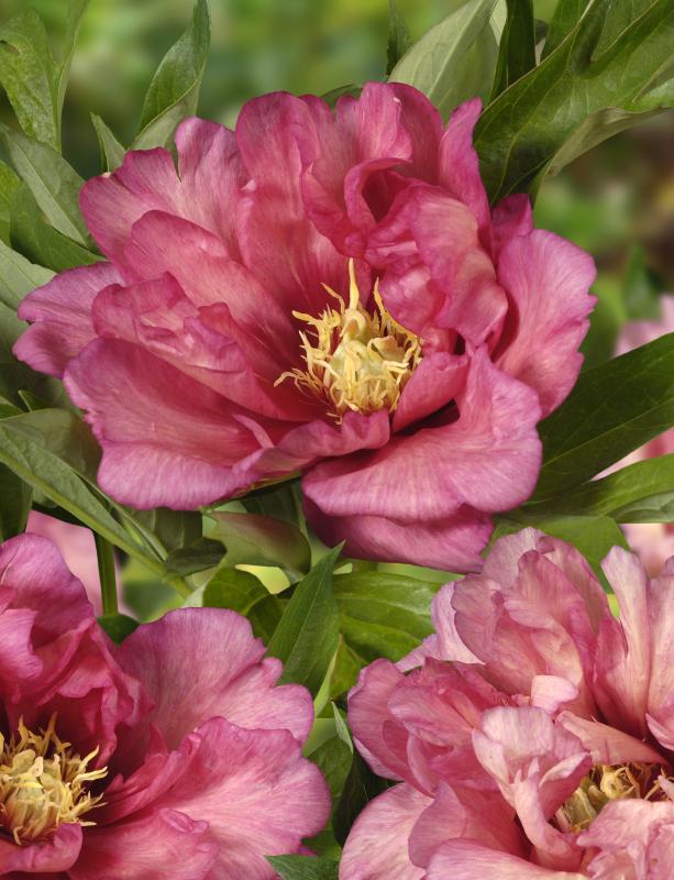 A cross between herbaceous garden peonies and woody tree peonies. Plant forms a sturdy clump of foliage 25-30” tall and wide that looks great spring through fall. Strong stems hold flowers upright even after heavy rain. This bright pink, fragrant flower makes excellent cut flowers and adds appeal to any garden. Not particular about soil.  Grow in full sun or light shade for best flower production. Mulch to keep roots cool and moist. Do not over fertilize.   Zone 4-8.