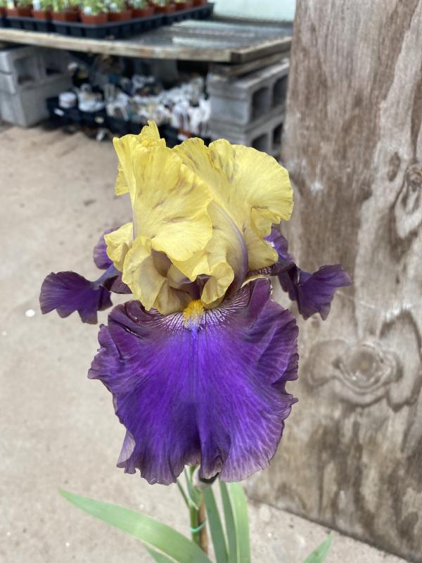 Fans of broad, flat, pointed leaves grow from thick rhizomes that creep along the soil surface. Flower stalks emerge bearing large buds that open to big papery irises with bearded falls. Large ruffled bicolor iris with dark purple falls and bright yellow standards. Full sun in average to dry, well drained soil that does not remain too wet in winter. Zone 3-10. Deer resistant.