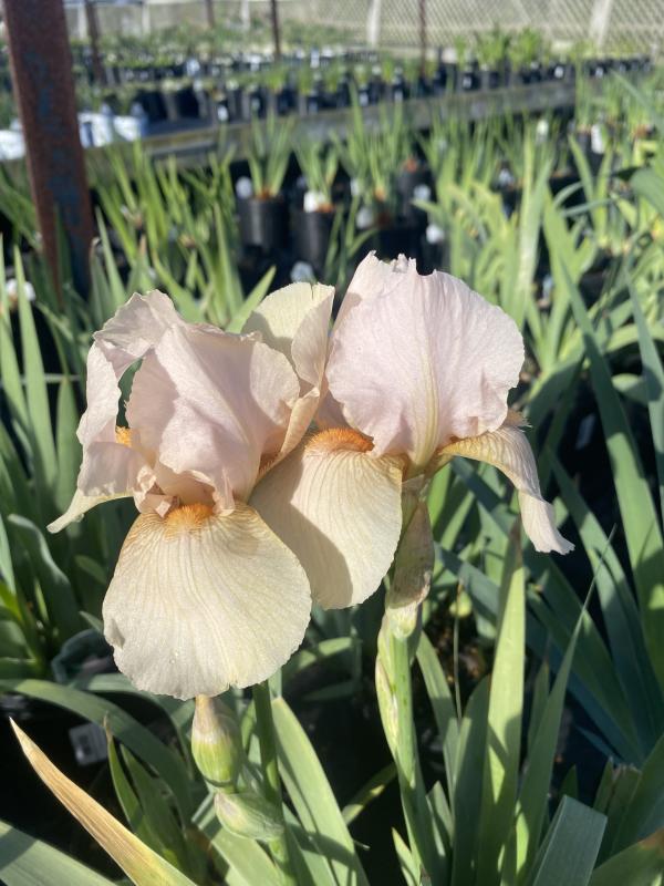 Fans of broad, flat, pointed leaves grow from thick rhizomes that creep along the soil surface. Flower stalks emerge bearing large buds that open to big papery irises with bearded falls. Near white petals with a tinge of pink, complimented by a dark tangerine beard. Full sun in average to dry, well drained soil that does not remain too wet in winter. Zone 3-8.