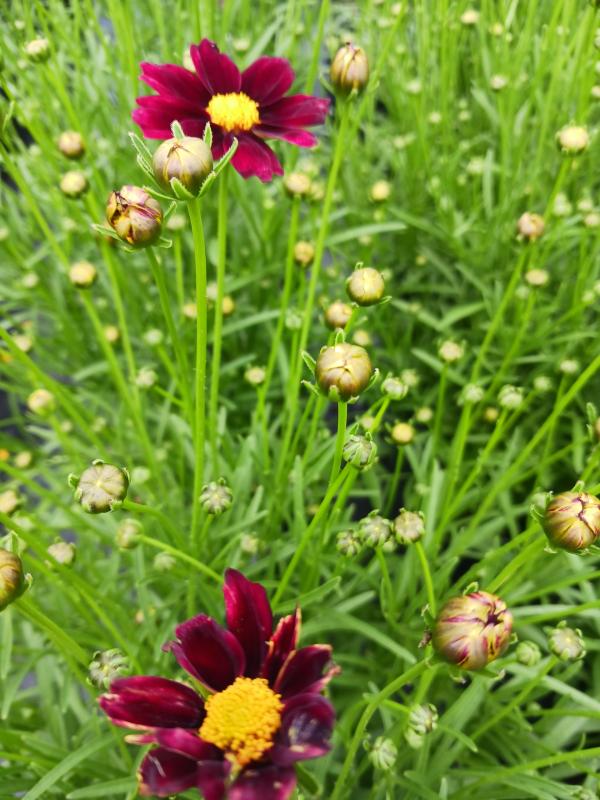 Hybrid coreopsis with red flowers with a yellow eye. Very compact selection from the breeder of the Big Bang series. Flowers are sterile and wonβt reseed. looms from summer- to frost- with a little help deadheading. Tough, easy to grow perennial for full sun in dry soil. Zone 5-8. Good drainage over the winter is a must. Deer resistant, attracts butterflies.