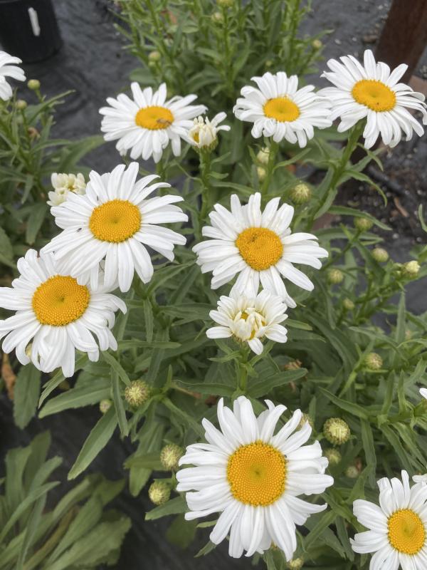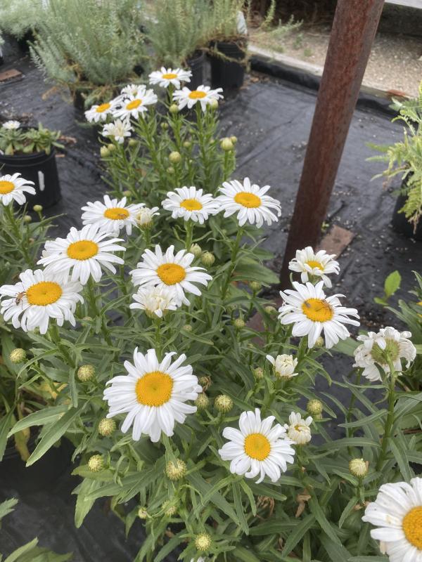 Robust perennial and cut flower favorite. A compact growing and floriferous plant with dark, shiny, toothed leaves that form clumps and send up stiff stems bearing large single daisies all summer long. 3-4 inch, pure white single daisies with a golden yellow center. Blooms from spring to summer. Full sun in average soil. Zone 4-9. Deer and rabbit resistant.