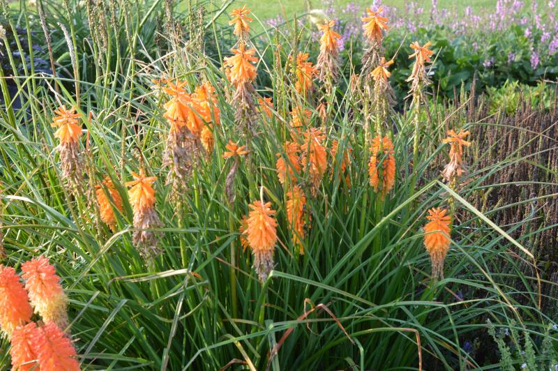 THis red hot poker brings a unique color to your flower beds.It produces spikey brilliant orange blooms over green grass-like foilage.Upright habit.Great for cut flowers.plant with heliopsis,helenium,baptisia,daisy.
