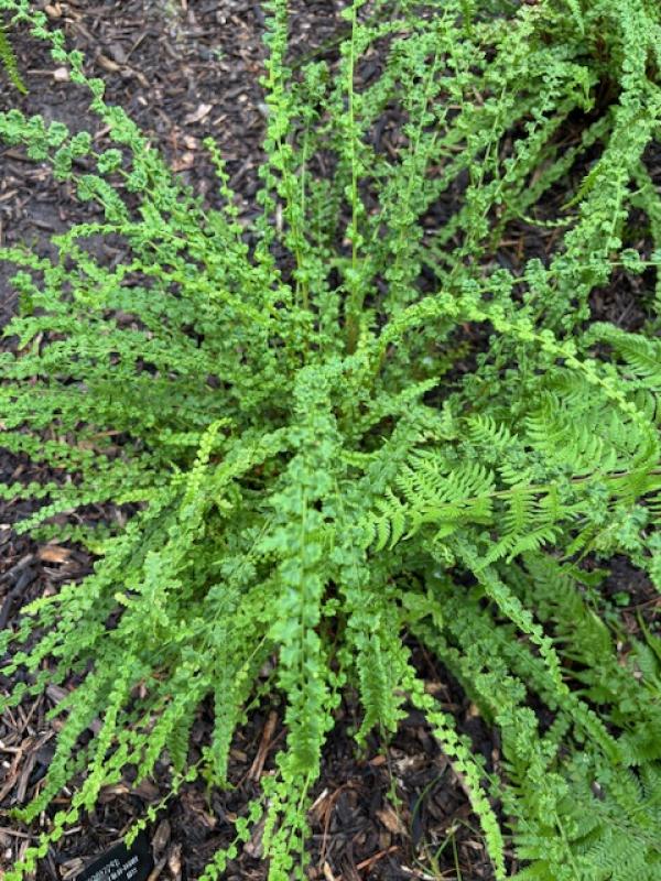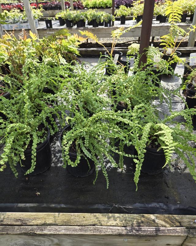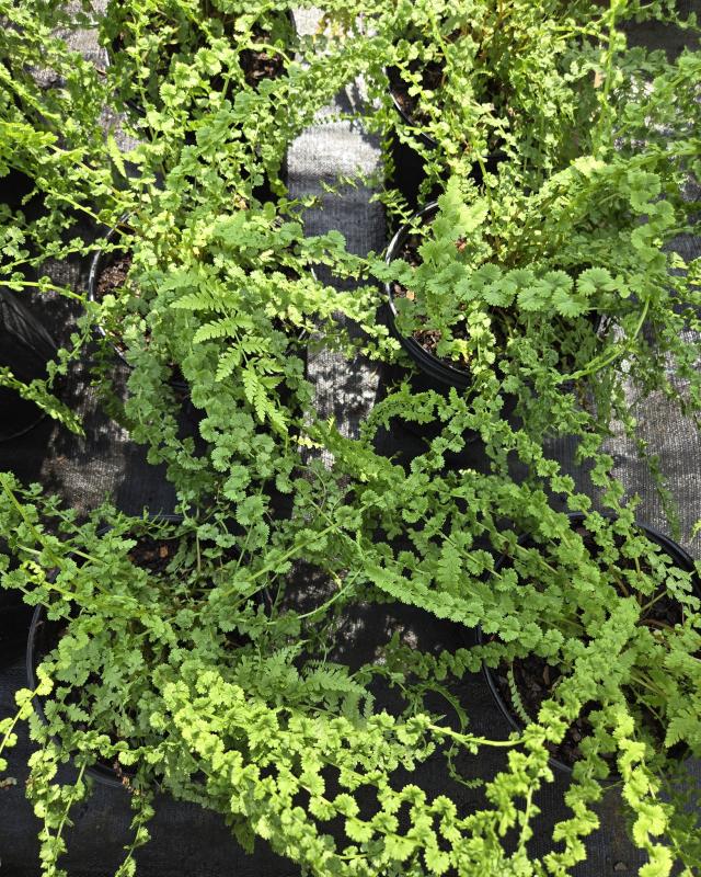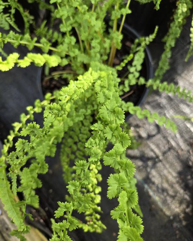 Athyrium filix-femina 'Frizelliae', also known as Tatting Fern, is a unique selection of (Athyrium filix-femina). It's characterized by its distinctive, bead-like pinnae (leaflets) that are rolled up and closely attached to the midrib of the frond, resembling tatting lace. This fern is a relatively small, deciduous plant, typically reaching 1 to 1.5 feet in height and spreading up to 2 feet wide. It thrives in part shade to full shade and prefers moist, well-drained soil. Excellent specimen fern! Deer resistant.