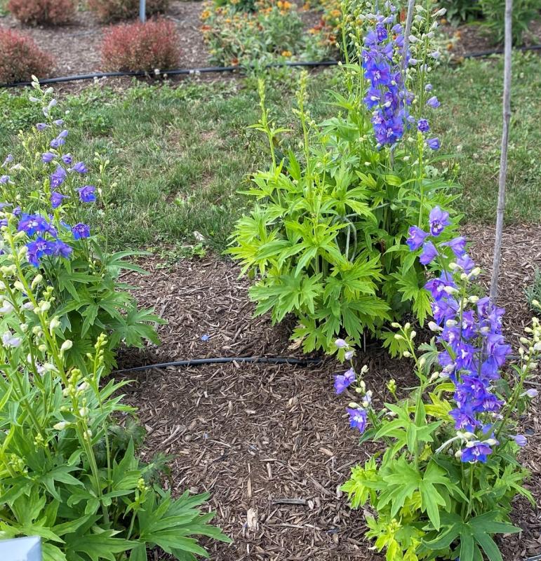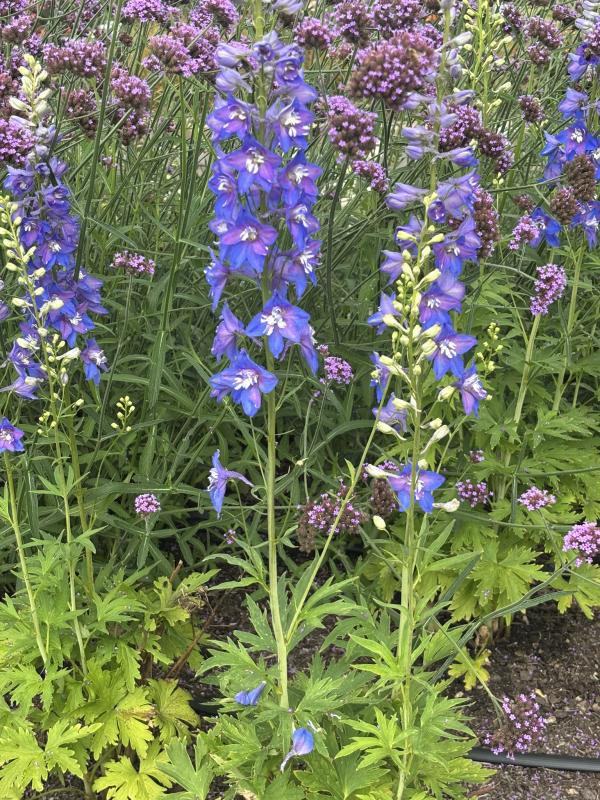 Basal mound of deeply divided leaves rise on stiff stems and produce long, broad spikes of flowers. Flower stalks are hollow and may need staking, or protection from the wind. Very rich, deep blue flowers accented by a pop of white in the center of each flower. Prefers average to moist, humus rich soil in full sun. Delphiniums do best on basic soil, so add lime if your soil is acidic. Vigorous grower, tolerant of heat and humidity. Deer and rabbit resistant, attracts hummingbirds and other pollinators.