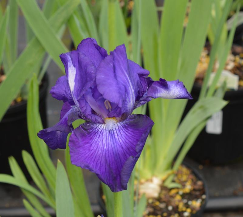 Fans of broad, flat, pointed leaves grow from thick rhizomes that creep along the soil surface. Flower stalks emerge bearing large buds that open to big papery irises with bearded falls. Funky violet and white speckled standards and falls. Full sun in average to dry, well drained soil that does not remain too wet in winter. Zone 4-9. Deer and rabbit resistant, attracts butterflies.