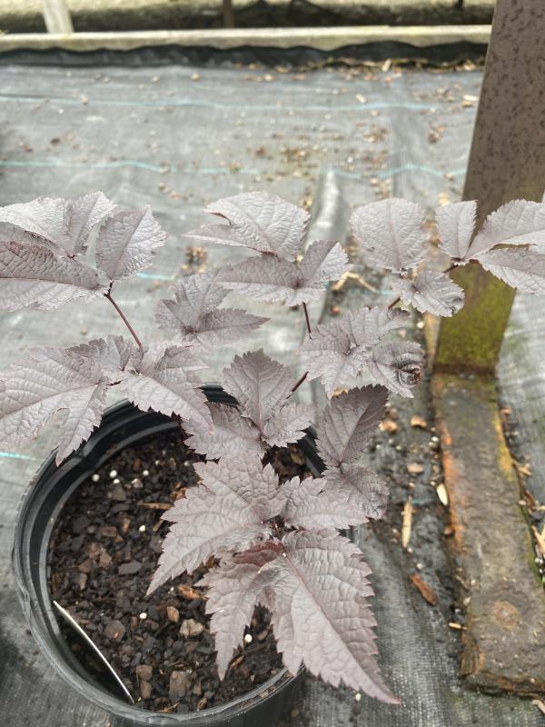 Incredible chocolate-purple lacy foliage.Possibly the deepest darkest foliage color by far in an Astilbe. The contrasting light, feathery pink flower plumes make for a visually appealing plant. Blooms of soft pink appear in late summer. Partial shade to full sun in organically rich, moist soil that does not dry out. Likes a boggy area in full sun.  Zone 5-8. Plant in mass along with other varieties of astilbe for a wave of colorful plumes all summer. Deer and rabbit resistant.