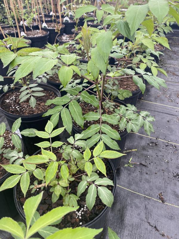 A deciduous and somewhat sprawling native shrub, Common Elderberry produces large clusters of white flowers that give way to dark purple/black, tasty, edible and medicinal fruits in summer. Great when planted in mass, as a specimen, in shrub boarders, as a screen and along bodies of water. With good erosion control and tolerance of wet soils, consider this shrub form zone 1 of rain gardens where water stands for a few hours post rain events.