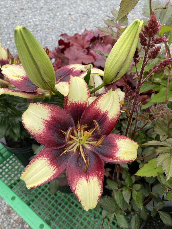This showy, fragrant lily grows from buried bulbs of overlapping scales. The flower stalks bear whorls narrow green foliage, with clusters of flowers at the top. The large, fragrant flowers produce a deep maroon center with creamy white tips. Excellent cut flower. Grows best when planted in rich, well drained soil, in part sun to part shade. Zone 3-8.
