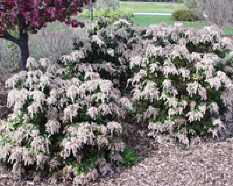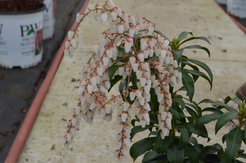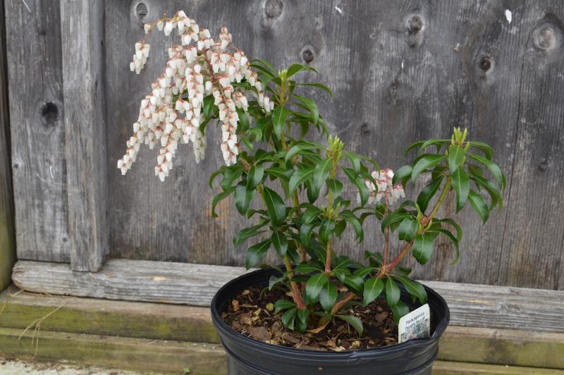 'Dorothy Wycoff' is a rounded evergreen shrub whose new foliage emerges deep coral to red and matures to glossy green leaves. In early spring, clusters of pink-white bell-shaped flowers bloom with an intoxicating fragrance similar to Lily of the Valley.