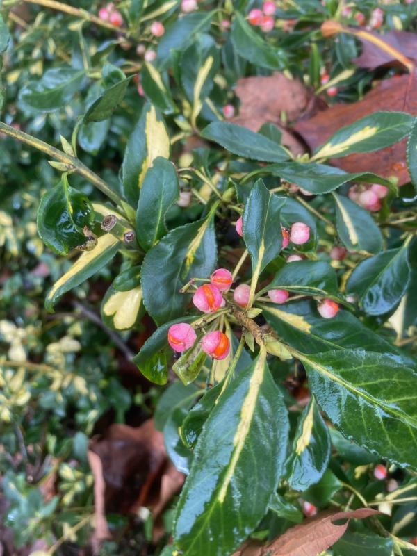 A dense thicket of evergreen color, this creeping euonymus spreads quickly and easily in full to part sun. Flowers are sparse, but the reddish-pink berries in fall add a fun contrast to the yellow stems that are covered in glossy yellow and green variegated foliage.