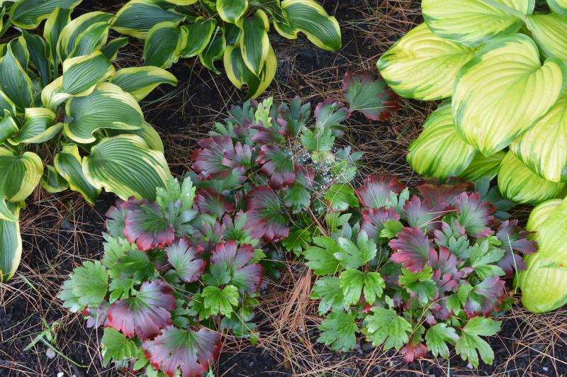 Very hardy, deciduous Heuchera relative. Leaves emerge green then age immediately to red and green. In the fall the green turns yellow to give excellent fall color. Slow growing. White, bell shaped flowers held in branched panicles. Prefers even moisture in partial shade. Zone 4-9.
