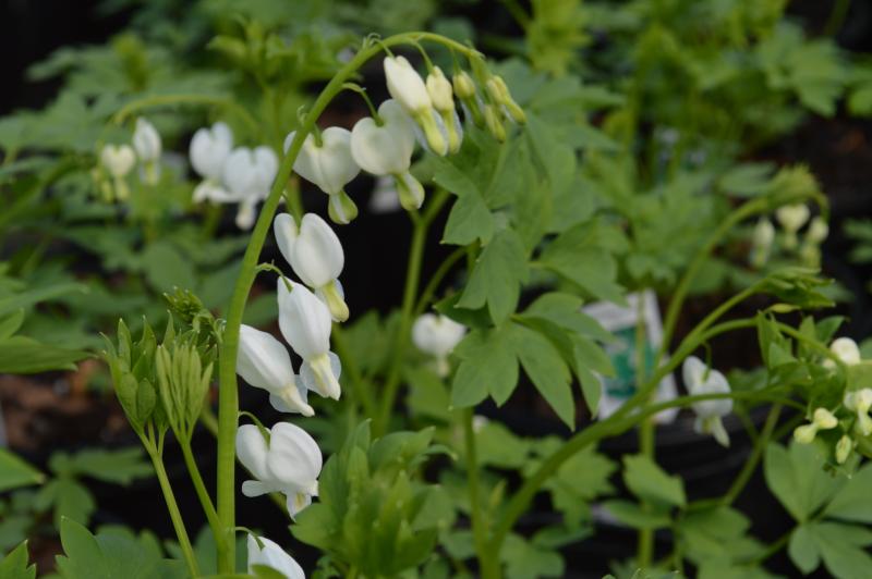 Robust grower with lacy green foliage and white heart-shaped blooms in the spring. Evenly moist humus-rich soil in shade or morning sun. Avoid evergreen shade as spring sun is necessary for good bloom. May not be as hardy as the red form, avoid wet feet over the winter. Zone 3-9. This is an ephemeral and will disappear after bloom. Combine with spring bulbs, peonies, iris, primroses, woodland phlox, columbines, and wild geraniums, hosta, ferns or astilbes.