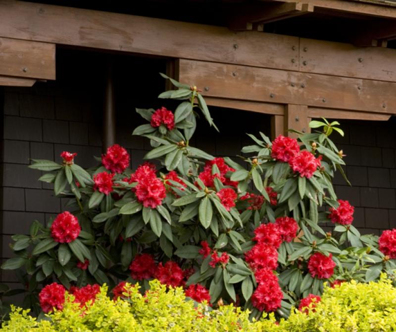 ‘Taurus’ blooms vivid red flowers that contrast exceptionally well against the dark green evergreen foliage. Good for borders, or hedges.
