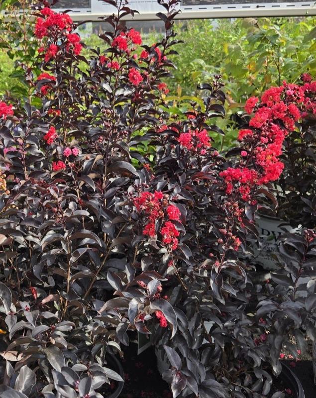This mid-sized crepe myrtle makes a statement in the garden with vivid red flowers that standout against the dark purple-black foliage. Works in containers as well as in the landscape, as a boarder, in mass plantings, or as a specimen.