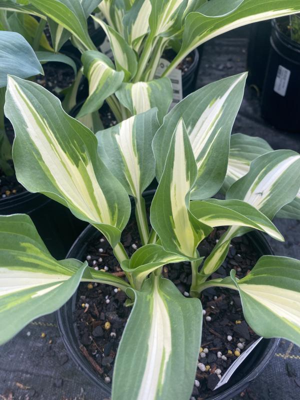 This upright plant produces rather pointed and twisted foliage, with creamy white centers and dark green margins. Blooms pale lavender flowers in mid to late summer. Easy to grow in part sun to full shade, in rich, moist soil. Zone 3-8.