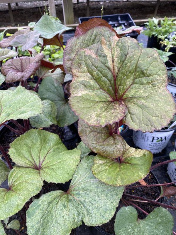 Large heart-shaped leaves are beautifully marked. Spotted and mottled green on a background of yellow in spring and dark in the summer. The veins and the leaf backs are dark red. Spikes of mustard yellow blooms. Sun to part shade in moist to boggy soil. More heat tolerant than other ligularia