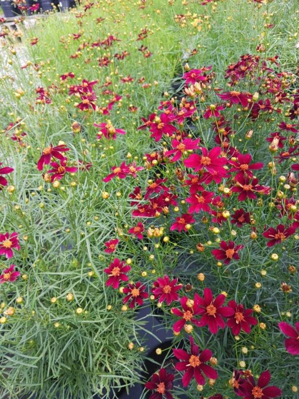 Permathread coreopsis with velvety red flowers with gold center.Will rebloom if cut back.Combine with tall sedum, liatris, daisy, helenium. Is native to the U.S. Deer resistant. And pollonators.