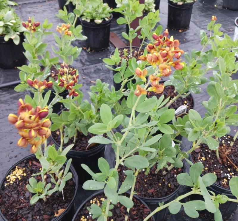 New series of inter specific baptisia that boasts bushier, more compact habit. gold orange flower spikes with dark stems in late spring followed by dark seed heads in the fall. Tall spikes of gold orange pea-like flowers. Full sun in well drained, average soil that is not overly fertile.