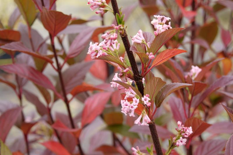 This hybrid viburnum from Dr. Tom Ranney's breeding program at NC State University is a wonderful blend of the spring blooming fragrant viburnums and nice fall color of some of our native viburnums. Tall upright habit makes a nice specimen or addition to the shrub border. 8-10 feet tall and 4-5 feet wide. Beautiful pink spring blooms feed early pollinators. Foliage bronzes in the fall. Remove older branches for best flowering. Prune after bloom as necessary. Zone 6-8.