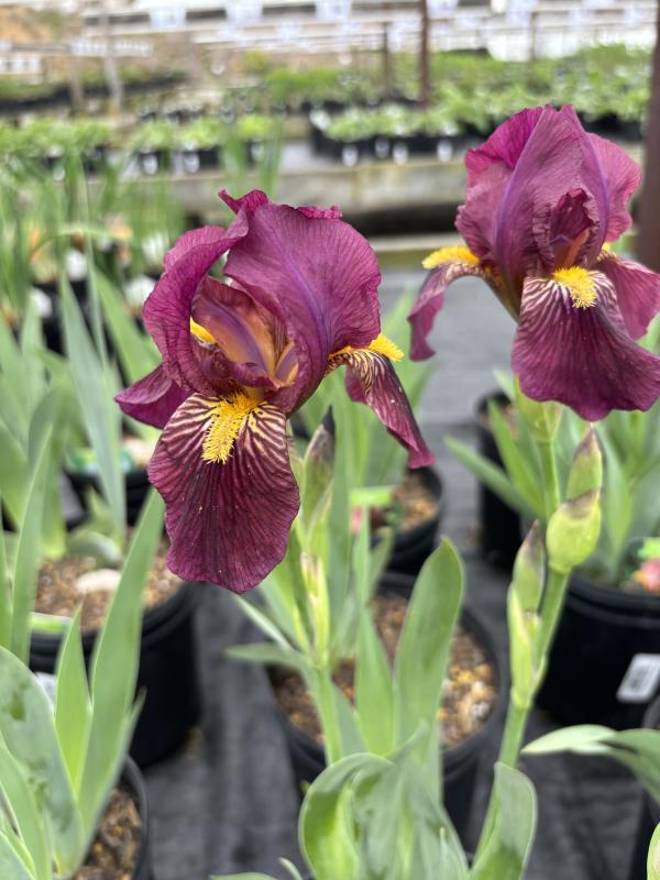 Fans of broad, flat, pointed leaves grow from thick rhizomes that creep along the soil surface. Flower stalks emerge bearing large buds that open to big papery irises with bearded falls. This Iris features plum red petals with a dark blotch and an orange beard. Blooms from late spring to early summer. Plant in full sun in average to dry, well drained soil that does not remain too wet in winter. Deer and rabbit resistant.