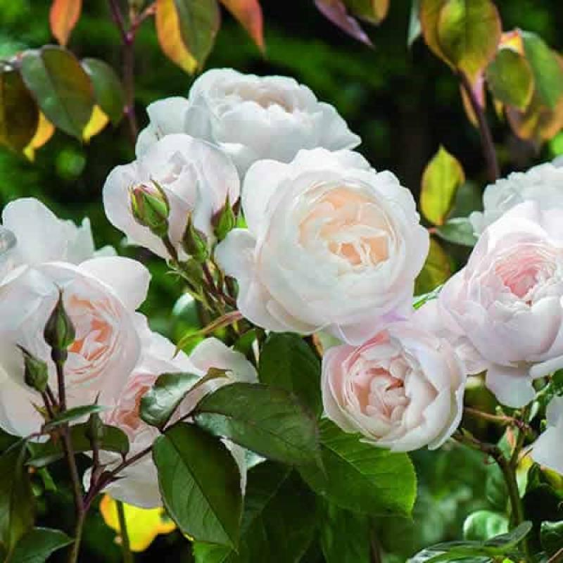 Peachy pink buds give way to white flowers that have a strong old rose fragrance with hints of almond blossom, cucumber, and lemon zest and shine with a slight pinkish-hue. This Rose has a bushy upright and neat form and makes for a great specimen, or can be added to borders, used as a hedge or planted in containers.