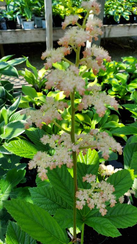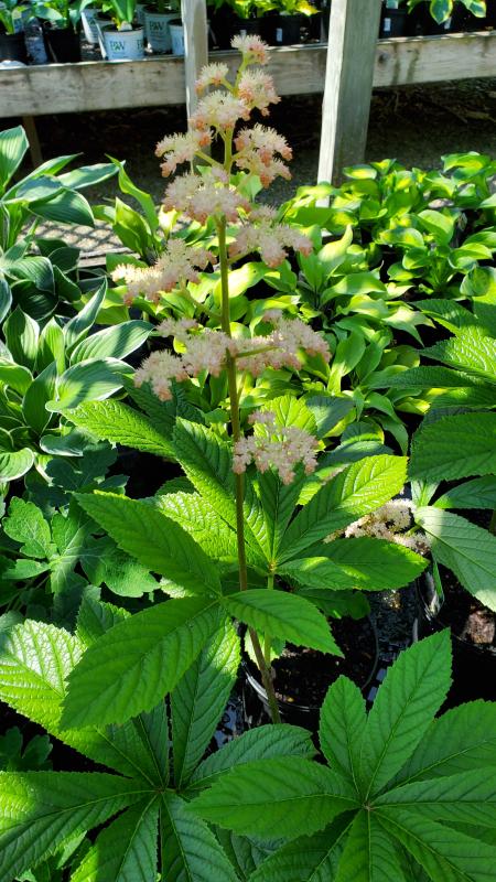 This perennial produces a large, rounded mound of coarse, deeply veined, serrated leaves grown in whorled groups. A bold architectural plant with tall flower stalks bearing clusters of rose pink flowers. Plant in full to partial shade in moist, organic soil. Deer resistant. Zone 4-9.