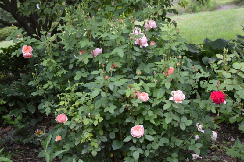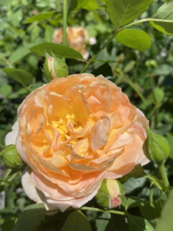 This large bushy shrub's slightly arching branches support the loosely arranged, orange petals with salmon pink hues. These blooms have a warm tea fragrance with hints of cloves and spiced apple and contrast nicely against the disease resistant, bronze emerging and green maturing foliage. 'Lady of Shallot' looks wonderful in beds and boarders, and makes excellent cut flowers.