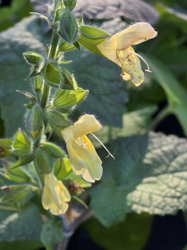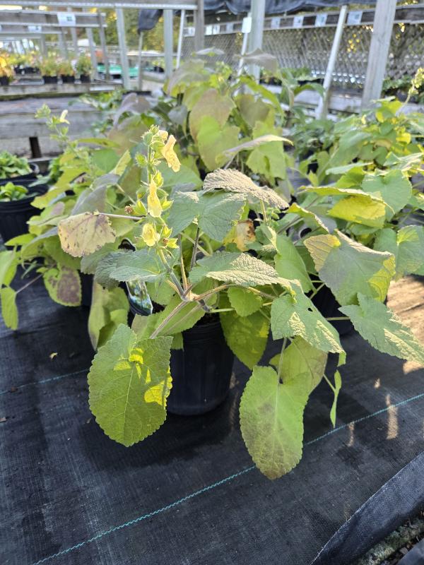Semi-shade salvia. Spectacular bold foliage effect in the garden with wide clumps of large hairy green arrow shaped leaves. Clump is adorned with short flowering stems in late summer. Woodland shady setting in any well drained to dry soil. Zone 4-9