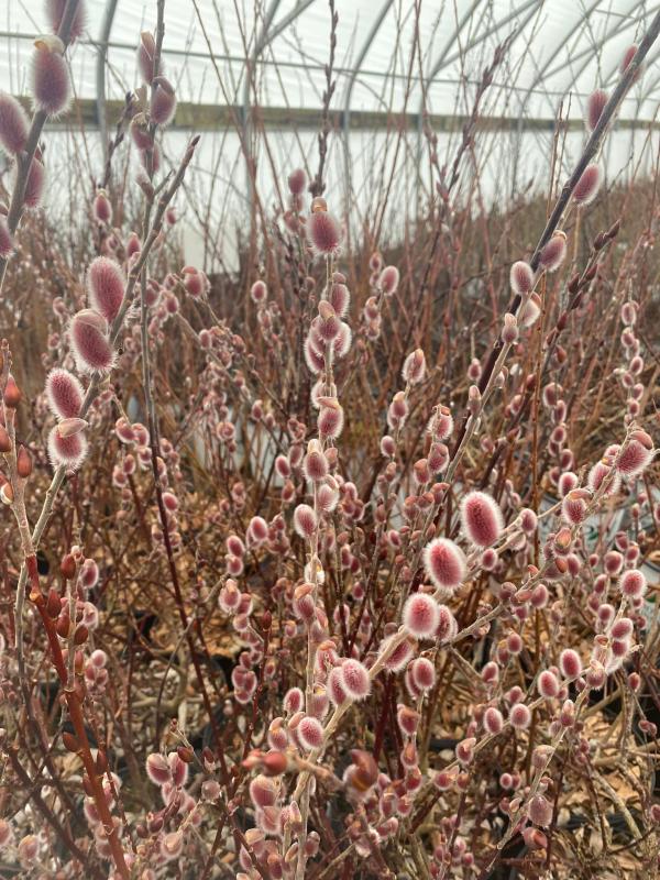 Mt. Asama' Pussywillow produces two toned pink and burgundy catkins with a silvery glow in early spring, offering the 'softest' touch of color to your space. Looks great in the back of the garden or and performs well in the cut garden.