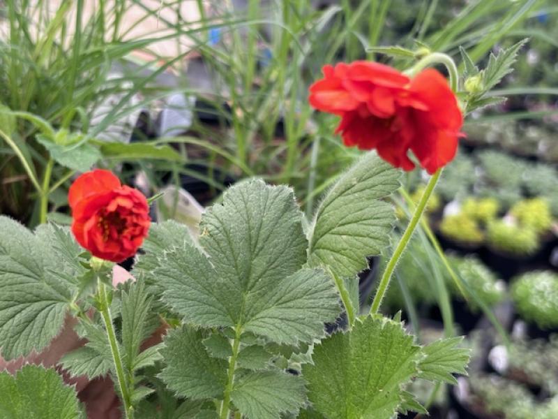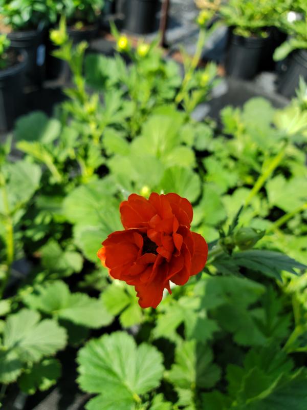 It is easy to grow. The leaves are deep green with a compact habit. Mounding habit. Ruffled scarlet-red to orange double blossoms on airy branching stems. Full sun in moist, loamy soil. Sun to part shade. Zone 5-9