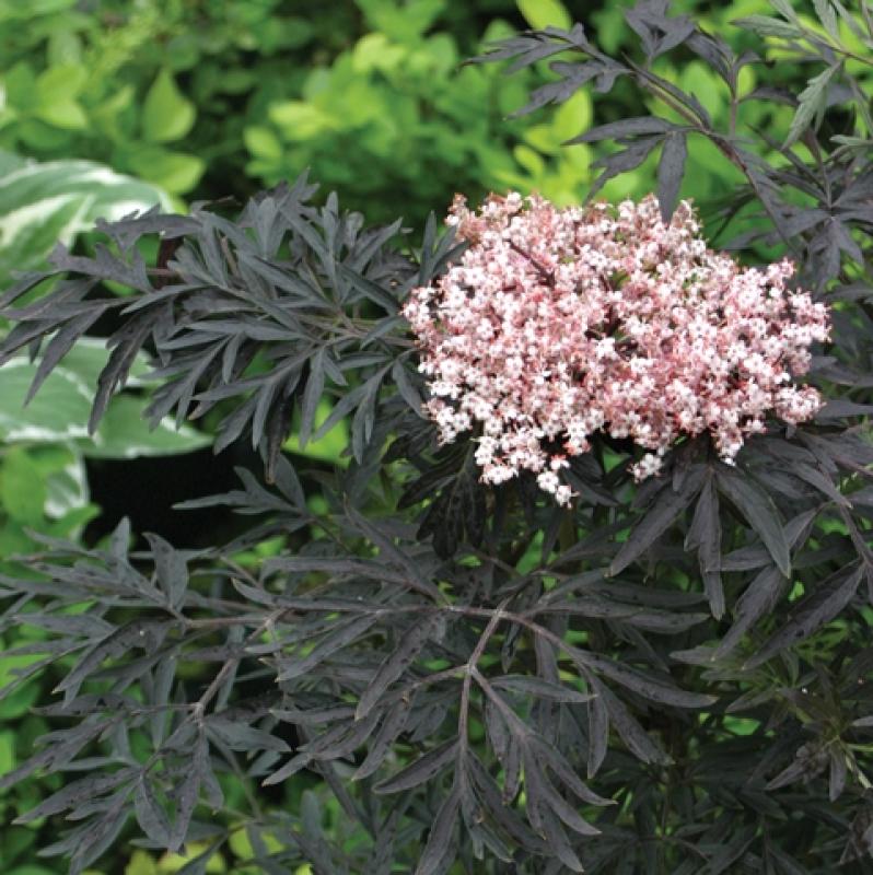 ‘Black Lace’ is a ornamental elderberry with lacy, near black foliage creating a stunning contrast against the light pink blooms. A great boarder, container, landscape or specimen plant.