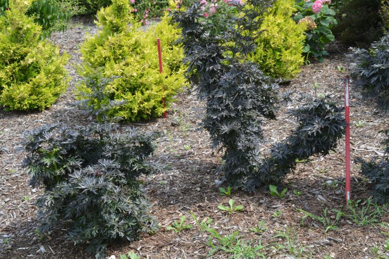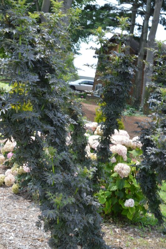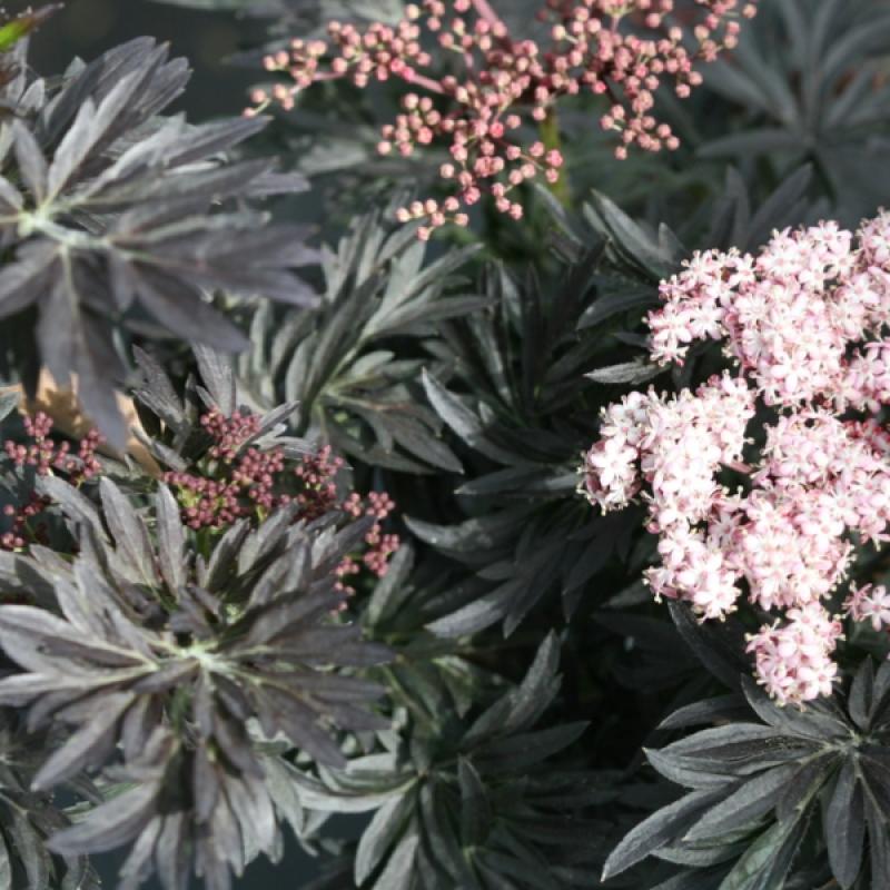 An upright narrow variety, 'Black Lace' delivers all the classic ornamental values of Elderberry without taking up a lot of horizontal space. Deep dark green and purple foliage is a stunning background for the light pink lacy flower caps that bloom in spring. Produces dark purple droops of berries in late summer when planted with a male such as 'Black Lace'.