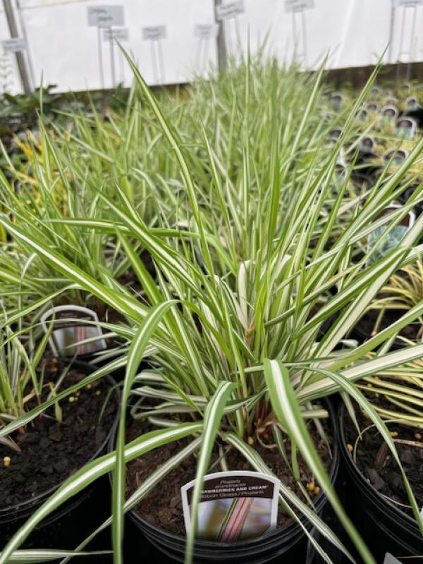 Tri-color bamboo-like ornamental grass with arching, flat, green and white striped blades that are tinged with pink in spring. Aggressive Spreader Blooms June-July with panicles of white to pale pinkish flowers. Partial shade in wet soil (several inches of water) to dry clay or sand. Zone 2-9.