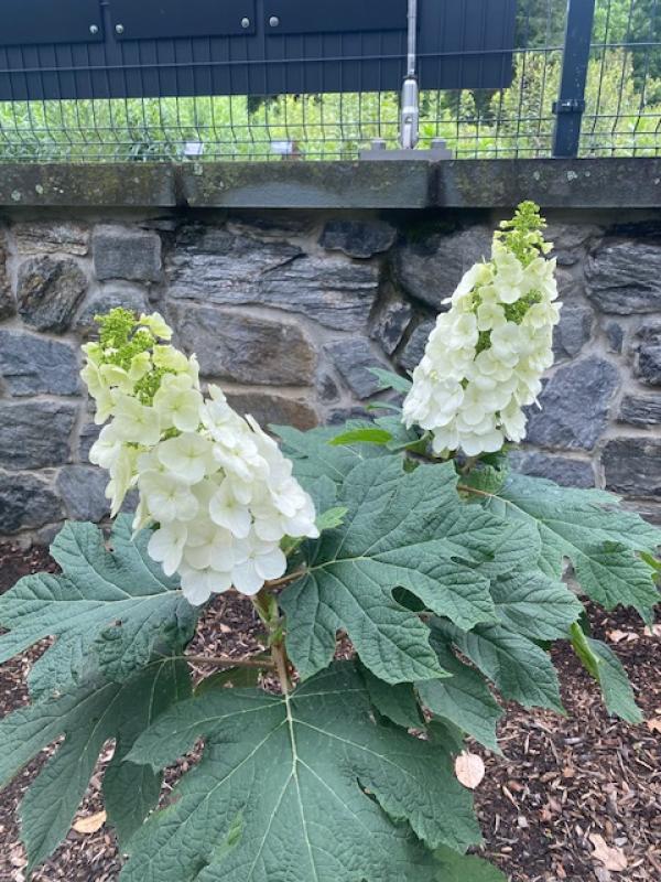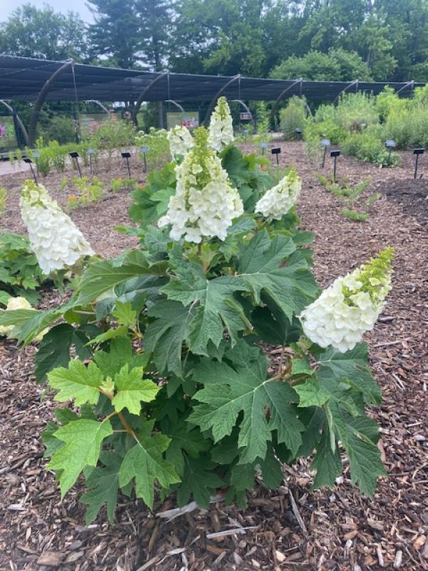 Wider than it is tall, this Oakleaf Hydrangea has a rounded, compact form. Large, white, upright, conical flower panicles turn deep pink by end of summer. Medium green deeply-lobed oak-like foliage turns vivid mahogany red in fall. Excellent for cut flowers. A nice specimen, or can be used for accents, foundations, borders, open woodland areas, and as an informal hedge.