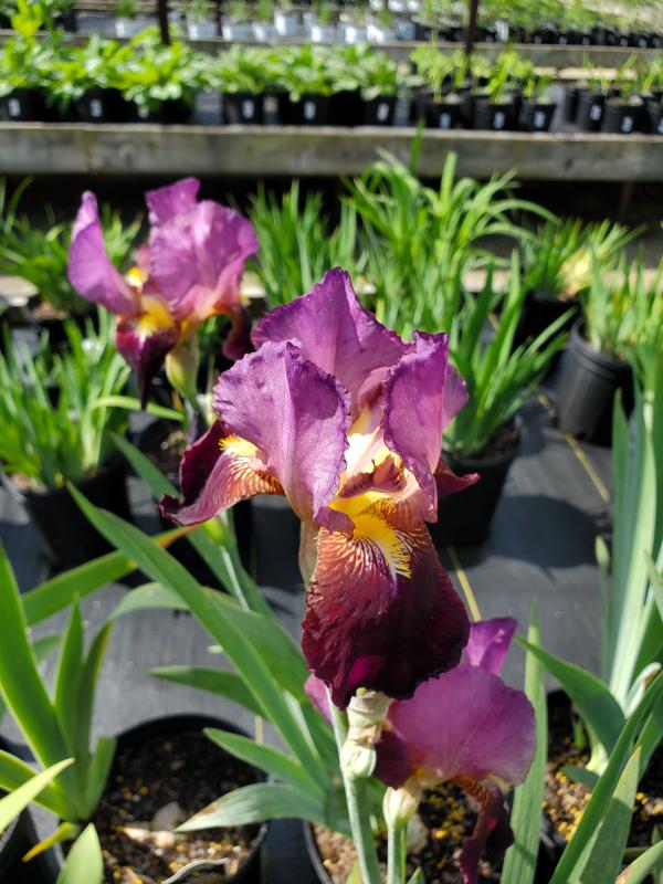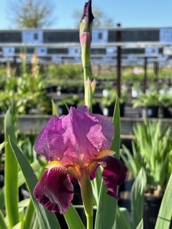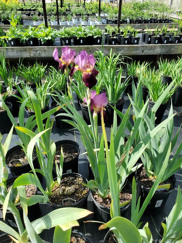 Tall bearded irises give flat broad pointed leaves that creep along the soil surface.Wine and roses iris give large pinkish purple large papery blooms that are Very attracting.Plant along with peonies,echinacea,amsonia,baptisia,heliopsis,shasta daisy,tall sedum.