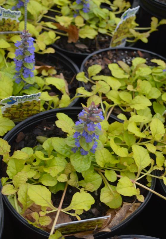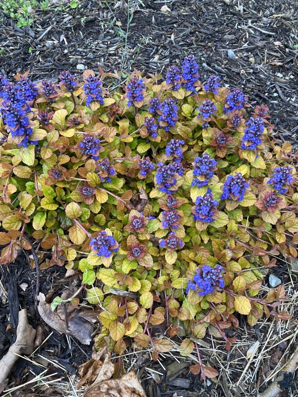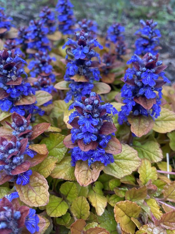 Low growing ground cover with tri-colored foliage of yellow, orange, and red. Blue bloom spikes emerge in early spring. Zone 3-9. Performs best in partial to full shade. Use in the front of a shady border, for mass groundcover, or under trees.